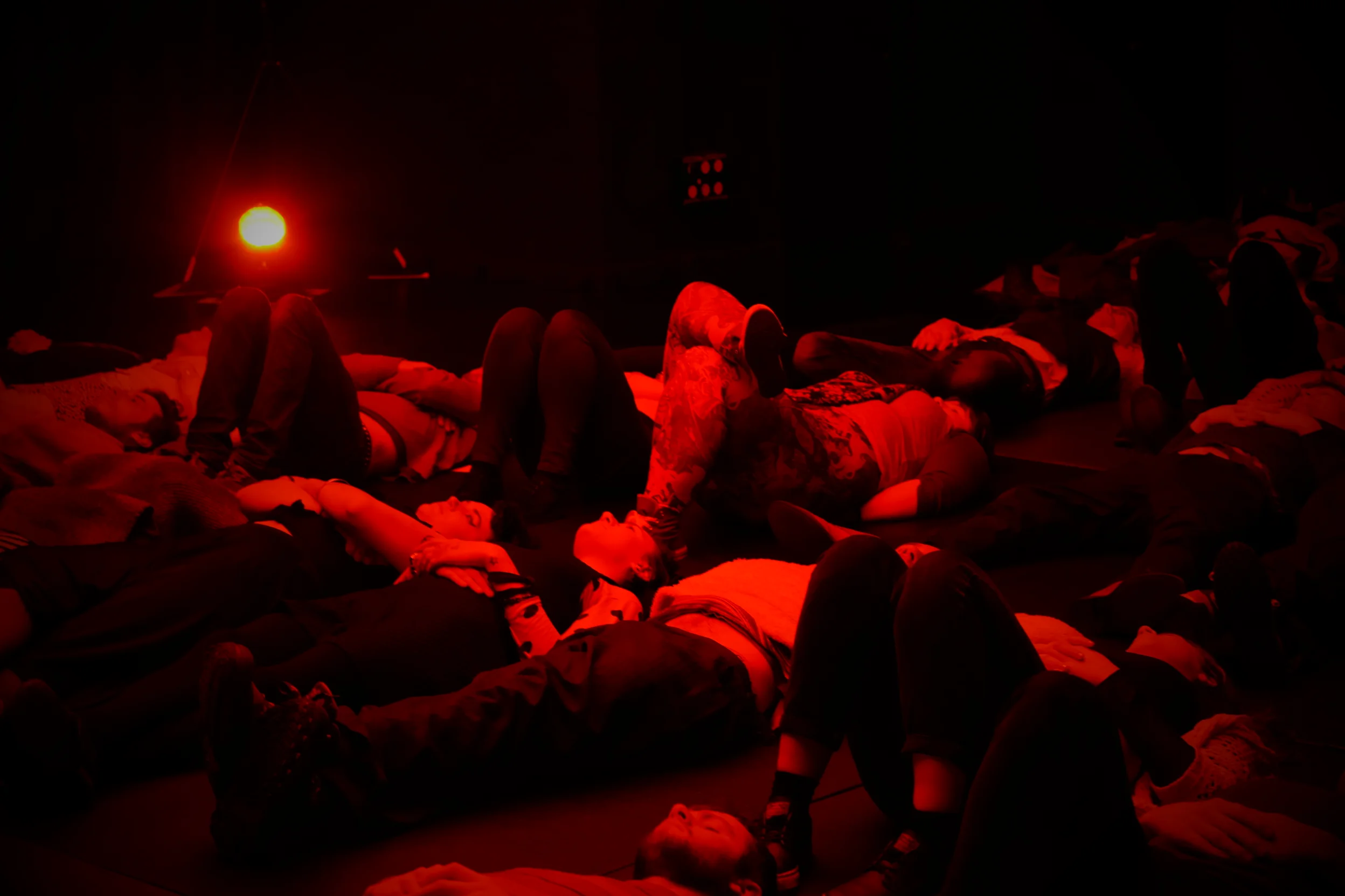 To accurately replicate the binaural recordings and spacial audio effects, audience members lay on the floor and wore headphones in a completely dark space, to create real and imagined sonic environments and musical pieces, while sparse layered film elements projected on the sloped ceiling above.